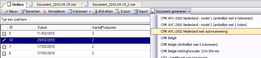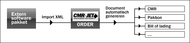 Met CMR-JET kan u makkelijk meerdere documenten van verschillende types automatisch genereren. Het idee hierbij is dat u in plaats van gegevens te importeren of in te voeren in het document zelf, u eerst de gegevens invoert in een "order". Daarna genereert u op basis van deze order de verschillende documenten. U kan zelf bepalen hoe deze generatie gebeurt. Allereerst kan u de velden van een order zelf samenstellen (Datum, Afzender, etc) zie ook: Variabele velden toevoegen. Vervolgens kan u een veld uit de order (bv 'Afzender') koppelen met een veld van een documenttype (bv CMR-NL - afzender). Wanneer het documenttype CMR-NL dan automatisch wordt gegenereerd, worden de 'Afzender' gegevens uit de order gekopieerd, en ingevoerd in het document. zie ook: Orderkoppelingen