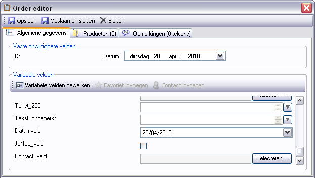De nieuwe velden zullen pas zichtbaar zijn in de order-editor als u die sluit en opnieuw opent.